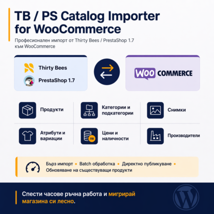 Прехвърли целия си онлайн магазин към WooCommerce бързо, удобно и интелигентно с TB / PS Catalog Importer for WooCommerce — модул, създаден да автоматизира импорта на продукти, категории, подкатегории, изображения, атрибути, вариации, наличности, цени, производители и още много директно от Thirty Bees или PrestaShop 1.7.