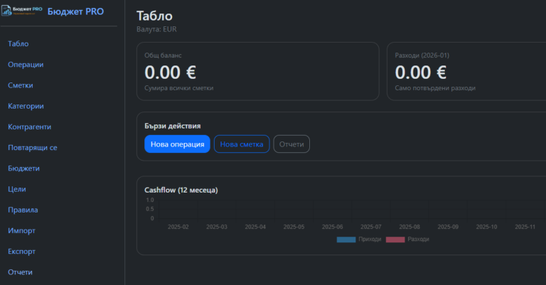 Бюджет PRO е модерна, мощна и сигурна уеб-базирана система за управление на финанси, създадена за хора и бизнеси, които искат пълен контрол над парите си – ясно, визуално и без хаос.